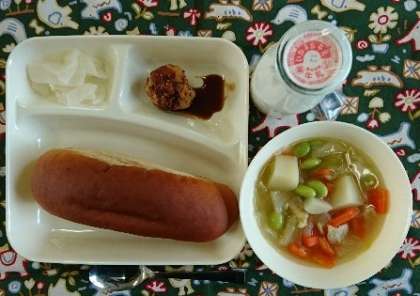 たこボール、洋風煮、だいこんのピクルス、黒糖パン、牛乳
