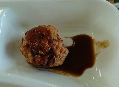 たこ、とうふ、でんぷん、小麦粉、かつおぶし、青ねぎを混ぜ合わせ丸くまとめて油で揚げています。砂糖、トンカツソース、ウスターソースで作ったたれをかけています。