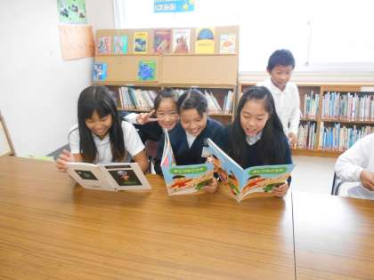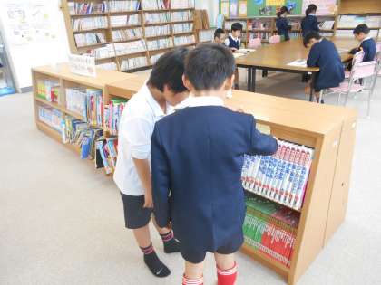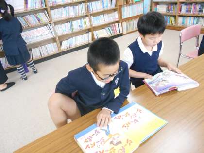 本が好きな子はいつも図書館にやってきます。遊びに来ている児童もいますが・・・本を手にとり興味を高めています。