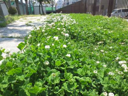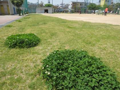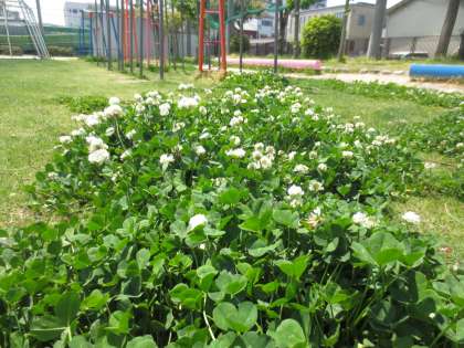 クローバーは芝生にとって雑草ですが、子どもたちはとっても気に入っています。四つ葉のクローバー探しに夢中です。