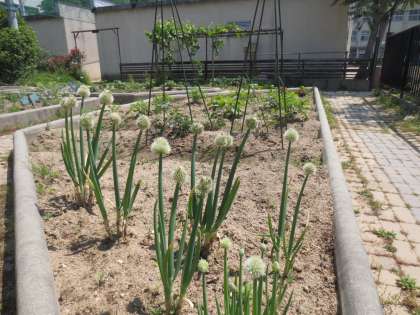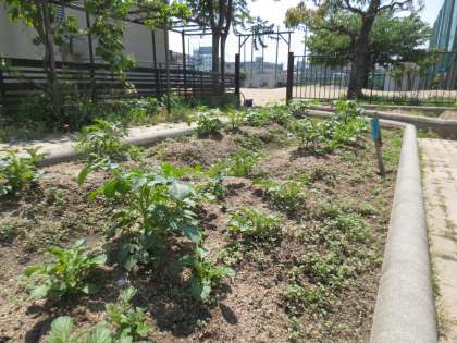 6年生はジャガイモ、巽南ガーデニングクラブ(保護者)は色々な野菜を植えています。学習園のブドウの木は花が咲きはじめています。