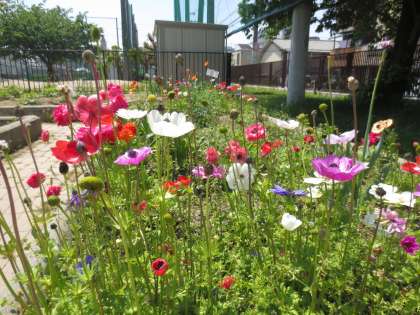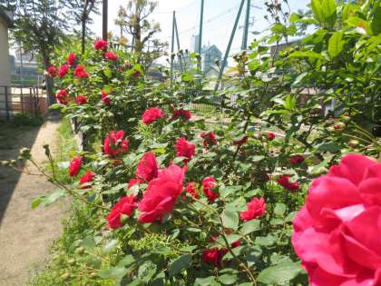 甘い香の真っ赤なバラが咲いています。他にもポピーや様々な草花が春を感じさせています。