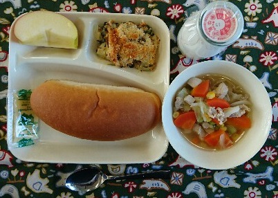 スープ煮、ほうれん草グラタン、りんご、コッペパン、ソフトマーガリン、牛乳