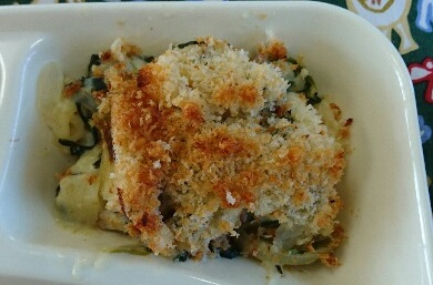 季節のほうれん草とマカロニなどの入ったグラタンです。ホワイトソースは小麦粉、牛乳、クリームなどを使って、給食室で手作りをしています。