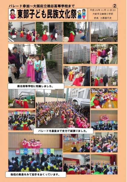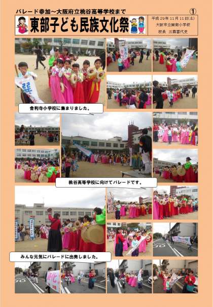 今年は舎利寺小学校から大阪府立桃谷高等学校まで、他校と一緒にパレードに参加しました。とても元気に演奏し笑顔でゴールの大阪府桃谷高等学校に到着しました。到着後、他校の発表をたくさん見ました。