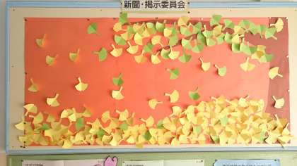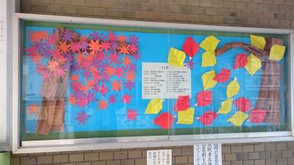 学校の玄関を入ってすぐのところに「秋」を感じる掲示がされています。紅葉の季節を感じていただければと思います。