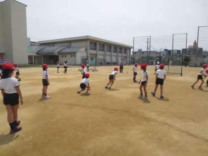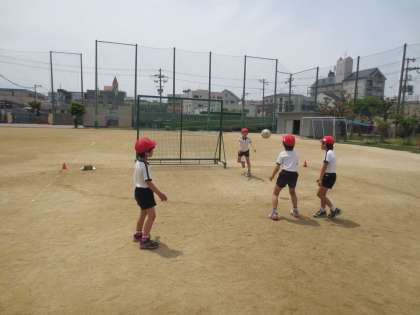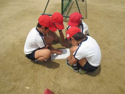 グループで話し合い、「めあて」や「動き」を確かめ合っています。グループ毎に話し合った動きを練習しています。