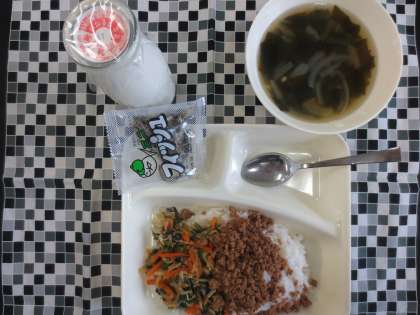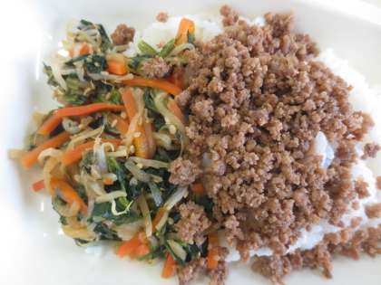牛挽肉、豚挽肉をにんにく、ごま油、砂糖、料理酒、こい口しょうゆ、コチジャンで炒めた肉みそと、だいこん、ほうれん草などの野菜のあえものと一緒にご飯にかけていただきます。児童に人気の献立です。