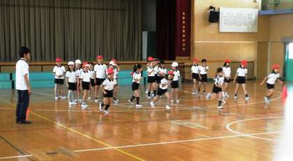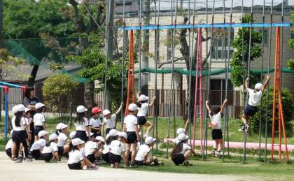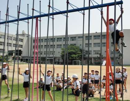 本日の2年生のたたいくは、体育館でサーキットトレーニングの基礎、運動場ではのぼり棒を使った器械運動の基礎を学びました。