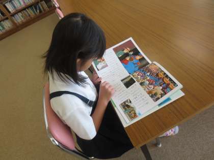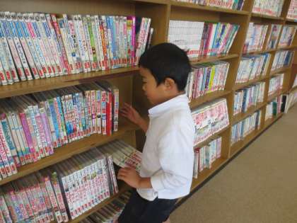 本の整理や修理、図書の貸出・返却をしていただいています。本が好きな子はいつも図書館にやってきます。新しい本を手にとりさらに興味を高めています。