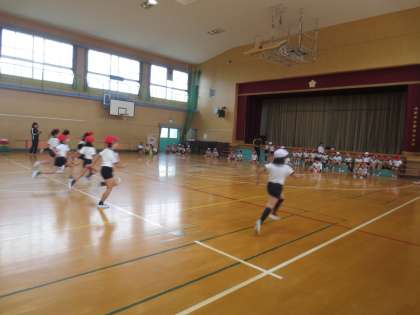 体育館で体力テストの持久力を「シャトルラン」で測定していました。粘り強く、汗いっぱいにどの子も走っていました。
