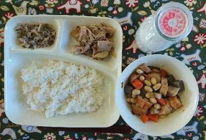 豚肉のごまだれ焼き、大豆の煮もの、切り干しだいこんのしそ甘酢づけ、ご飯、牛乳