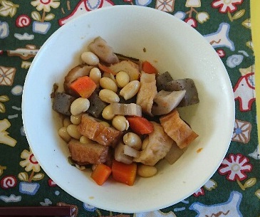主材の大豆に、ちくわ、こんにゃく、れんこん、にんじん、切こんぶの入った具だくさんの煮物です。献立コンクールの作品です。