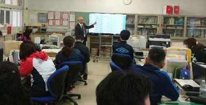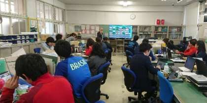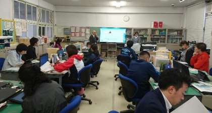 授業用パソコンやタブレットPCを活用し、「Sky Menu」のグループワークの授業形態や資料やワークシート等の配付や回収機能などの使用方法について学びました。
