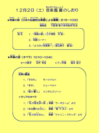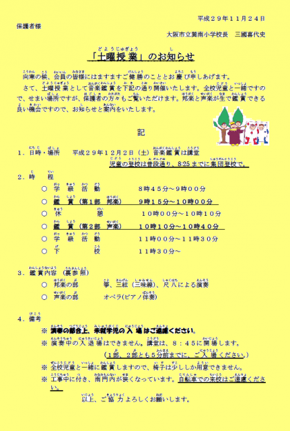 再度お知らせいたします。12/2(土) 土曜授業(音楽鑑賞)を行います。学習参観は実施いたしませんが、講堂で行う音楽鑑賞には保護者の方もご参加できます。尚、下記に音楽鑑賞参加について、ご配慮していただきたい事項を載せていますので、ご覧いただきご理解ご協力のほどよろしくお願いいたします。