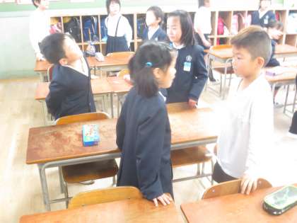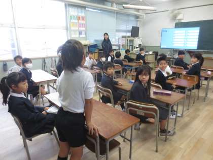 友だちに英語で「好きなことは?」ときき、その友だちも英語で「〜です」と返事をします。少しですが英語でのコミュニケーションを高めています。