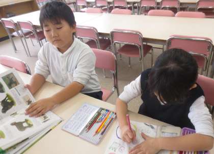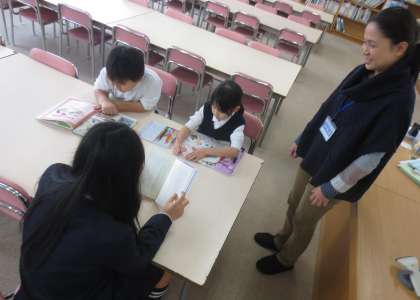 毎週、水曜日は学校図書館補助員の荘司先生に図書館を開放していただいています。水曜日は全ての休み時間に図書館を開放しています。本の整理や修理、図書の貸出・返却をしていただいています。本が好きな子はいつも図書館にやってきます。本を探し、席に着き、本のページをめくっていくと、集中して読み続けています。