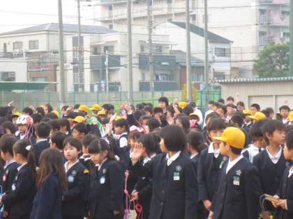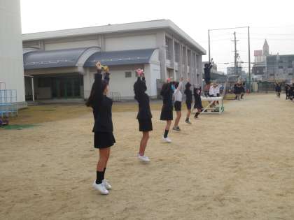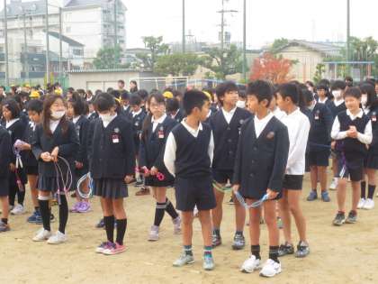 運動委員会の児童がリードして、全校でなわ跳び集会をします。運動場に全校児童が集まってきました。