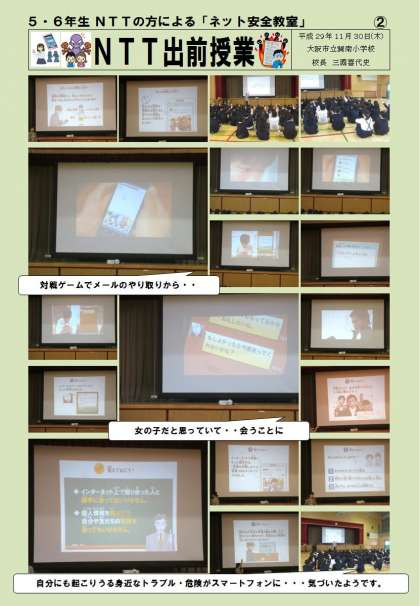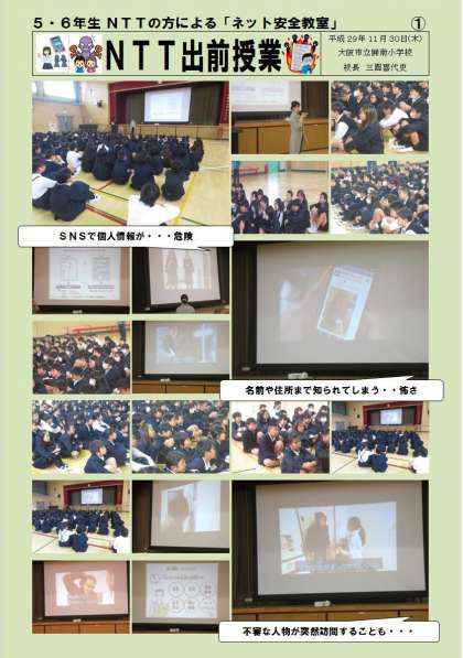11.30(木)「ネット安全教室」をNTTの方に開いていただき、5・6年生全員が授業を受けました。主にスマートホォンで、自分にも起こり得る身近なトラブルやルール・マナー等について、具体的に教えていただきました。子どもたちは、この教室で学んだことで、インターネット上のコミュニケーションについて、より具体的な対処方法や判断能力を育てていってくれると思います。