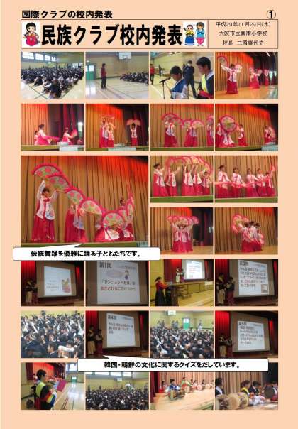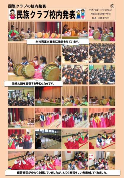 11/29(水)国際クラブの子どもたちが、全校児童の前で伝統舞踊・伝統太鼓と韓国・朝鮮の文化クイズを発表しました。優雅に踊り、逞しく太鼓の演奏を披露してくれました。クイズもとても楽しい内容で、みんな集中して発表をみていました。最後には全校児童から大きな拍手がおこりました。