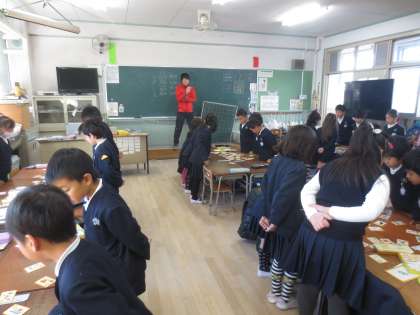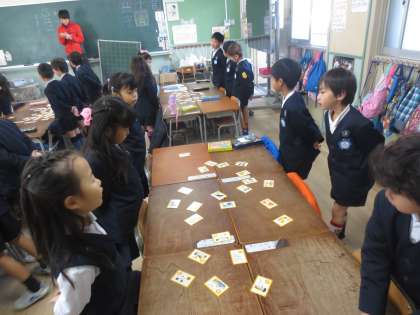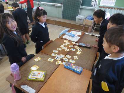 グループごとに英語カルタで遊んでいます。先生が読み上げて札を取り合います。また、簡単な単語も教えていっています。
