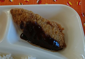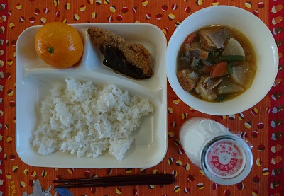 まぐろのフライ、豚肉とあつあげの煮もの、みかん、ご飯、牛乳