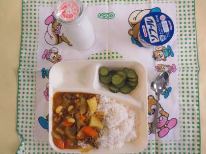 牛肉と大豆のカレーライス、きゅうりのピクルス、ヨーグルト、牛乳