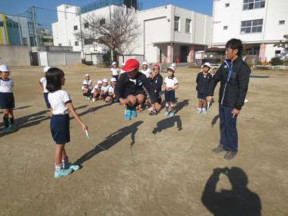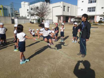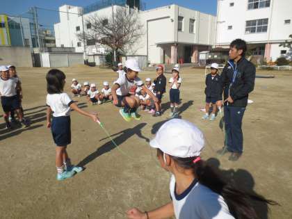 友だちの動きを見てみんなは、長なわのまわっている位置に注意して、なわの下に入ることに気がついていました。