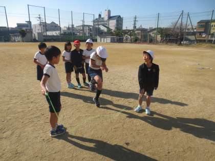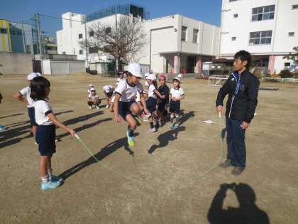 長なわを回すタイミングも難しく、子どもたちは何度も練習をしています。