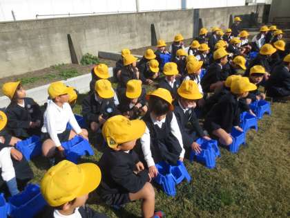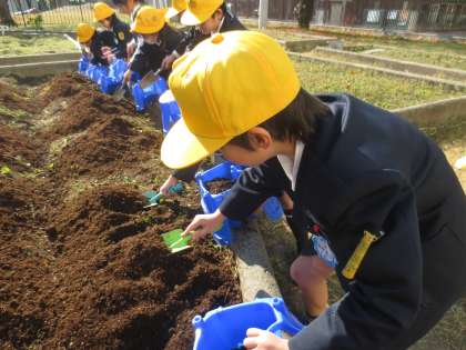 12/7(木)1年生の子どもたちが、一人一人の植木鉢にチューリップの球根を植えます。最初に自分たちの植木鉢に土を入れています。