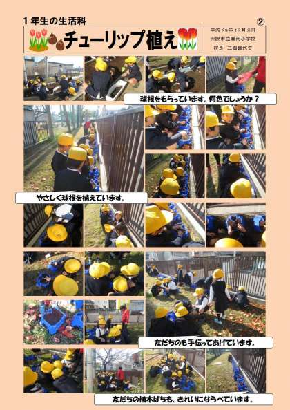 12/8(金)1年生の子どもたちが、一人一人の植木鉢にチューリップの球根を植えています。みんなで植えたチューリップの球根が、春にはきれいな花を咲かせて、校庭を花いっぱいにしてくれるでしょう。