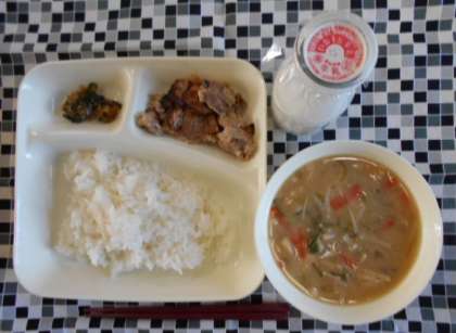 豚肉のしょうが焼き、さつまいものみそ汁、きくなとはくさいのごまあえ、ご飯、牛乳