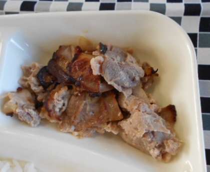 豚肉、たまねぎをしょうが汁、砂糖、料理酒、みりん、こい口しょうゆ、サラダ油を混ぜ焼いています。