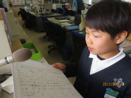 児童会で取り組んでいる「あいさつ週間」の呼びかけをしています。「おはよう」「こんにちは」「さようなら」「おやすみなさい」の四つのあいさつがあります。あいさつは、してもされても気持ちのよいものです。みなさん積極的にあいさつをしましょう。