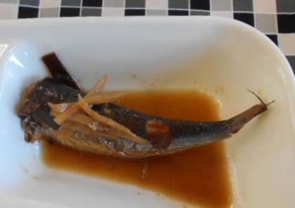 ミニバットにしょうが、砂糖、酢、こい口しょうゆ、料理酒、水を混ぜ、いわしを入れて焼き物機で煮ています。骨ごと食べられる魚です。