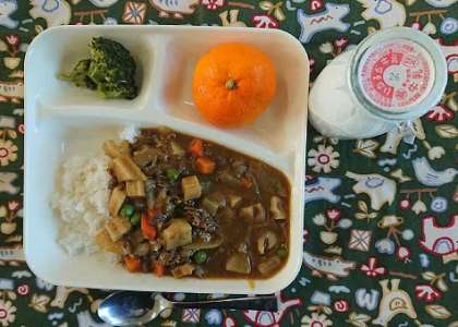 冬野菜のカレーライス、ブロッコリーのサラダ、みかん、牛乳