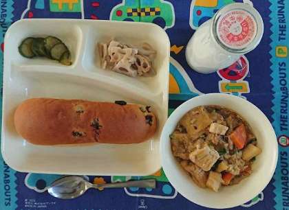 中華煮、れんこんのオイスターソース焼き、きゅうりの辛みづけ、レーズンパン、牛乳
