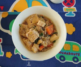 豚肉、いか、あつあげ、はくさい、たまねぎ、にんじん、にらの入った中華煮です。