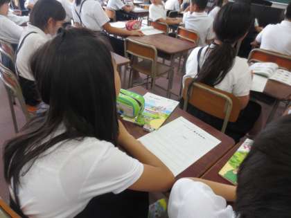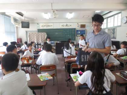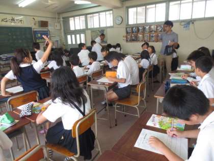 5年の英語活動の様子です。アンディー先生と英語でビンゴゲームをしています。リーチ!ビンゴ!みんな英語活動を楽しんでいます。
