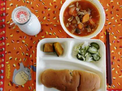 ケチャップ煮、焼きかぼちゃ、グリーンサラダ、レーズンパン、牛乳
