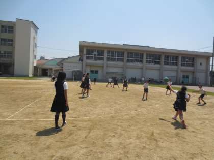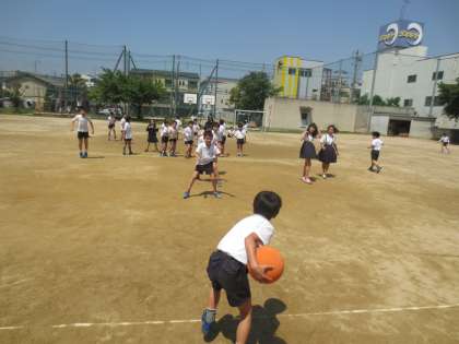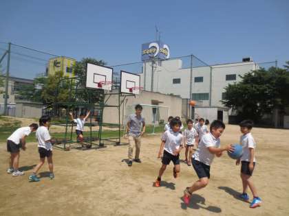ドッジボールやバスケットボールを異学年同士で仲良く遊んでいます。