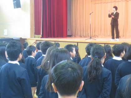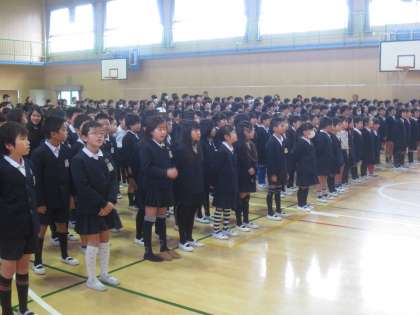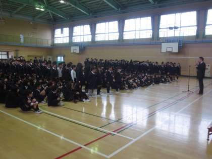 次に上野先生が生活指導の話をしました。3学期は一番短い学期ですが、次の学年に上がる準備をする大切な期間です。一人一人が気持ちをひきしめ、成長した自分に自信をもち卒業・進級に向かって歩んで行って下さい。