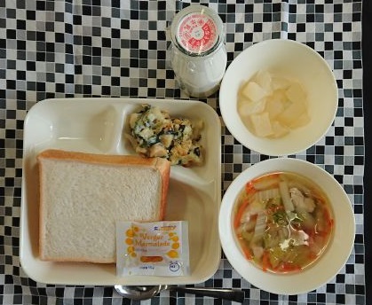 ほたて貝にグラタン、スープ、和なし(缶詰)、食パン、マーマレード、牛乳