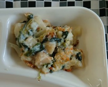 ほたて貝を主材に、マカロニ、たまねぎ、ほうれん草の入ったホワイトグラタンです。
