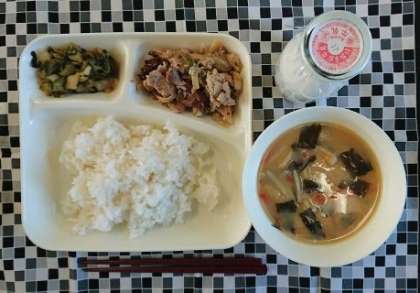 豚肉のごまだれ焼き、みそ汁、きくなとはくさいのおひたし、ご飯、牛乳