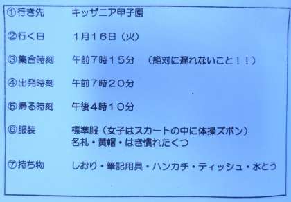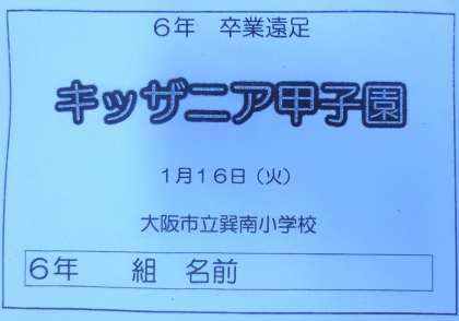 明日1/16(火)は6年生の卒業遠足です。集合時刻が早いのでご注意ください。午前7時15分までに集合です。7時20分には出発します。行き先は「キッザニア甲子園」です。お弁当はいりません。持ち物については「しおり」をご覧ください。午後4時10分頃に帰校します。