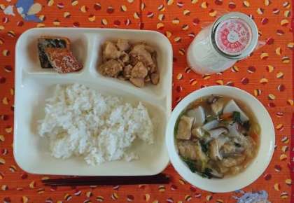 鶏肉と白ねぎのいため煮、のっぺい汁、やきかぼちゃのごまだれかけ、ご飯、牛乳