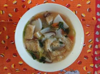 さといも、うすあげ、だいこん、はくさい、にんじん、みつば、生しいたけの入ったとろみのある汁ものです。