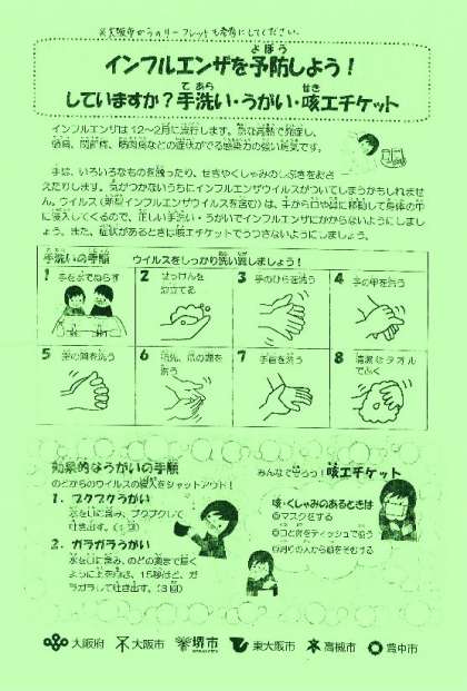 全国でインフルエンザが流行しています。生野区でも、学級休業や学年休業をしている学校が増えてきています。巽南小学校もインフルエンザで欠席する人が、少しずつ増えてきています。もう一度、自分の生活を見直し、インフルエンザにかからないよう、また、うつさないようにしましょう。