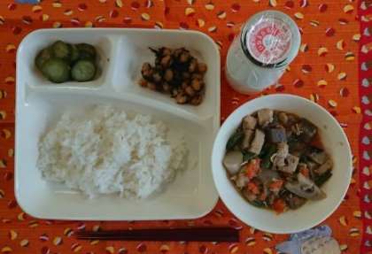 筑前煮、ひじき豆、きゅうりのかつお梅風味、ご飯、牛乳